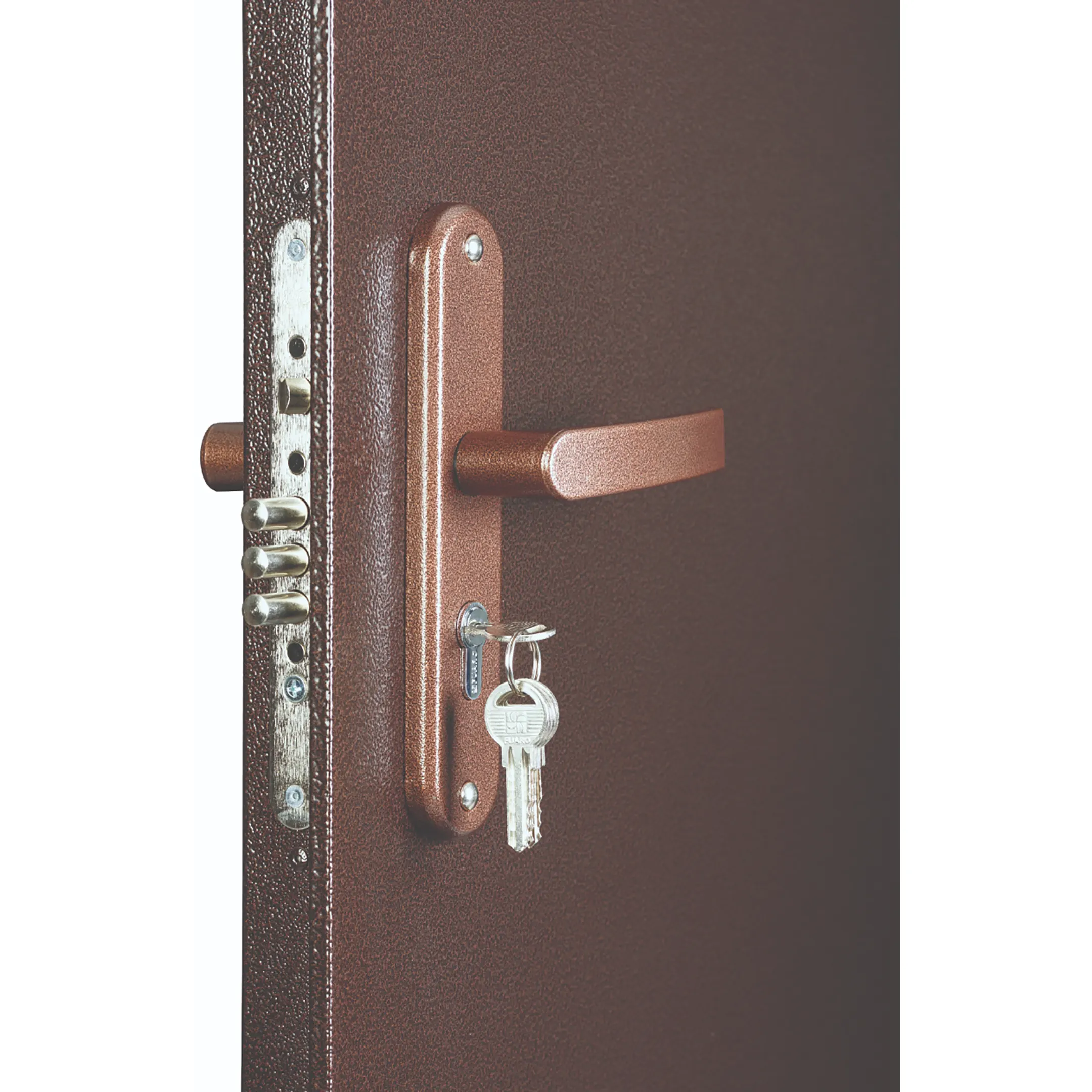 - Ручка на планке в комплекте с замком, окрашенная в медный цвет.