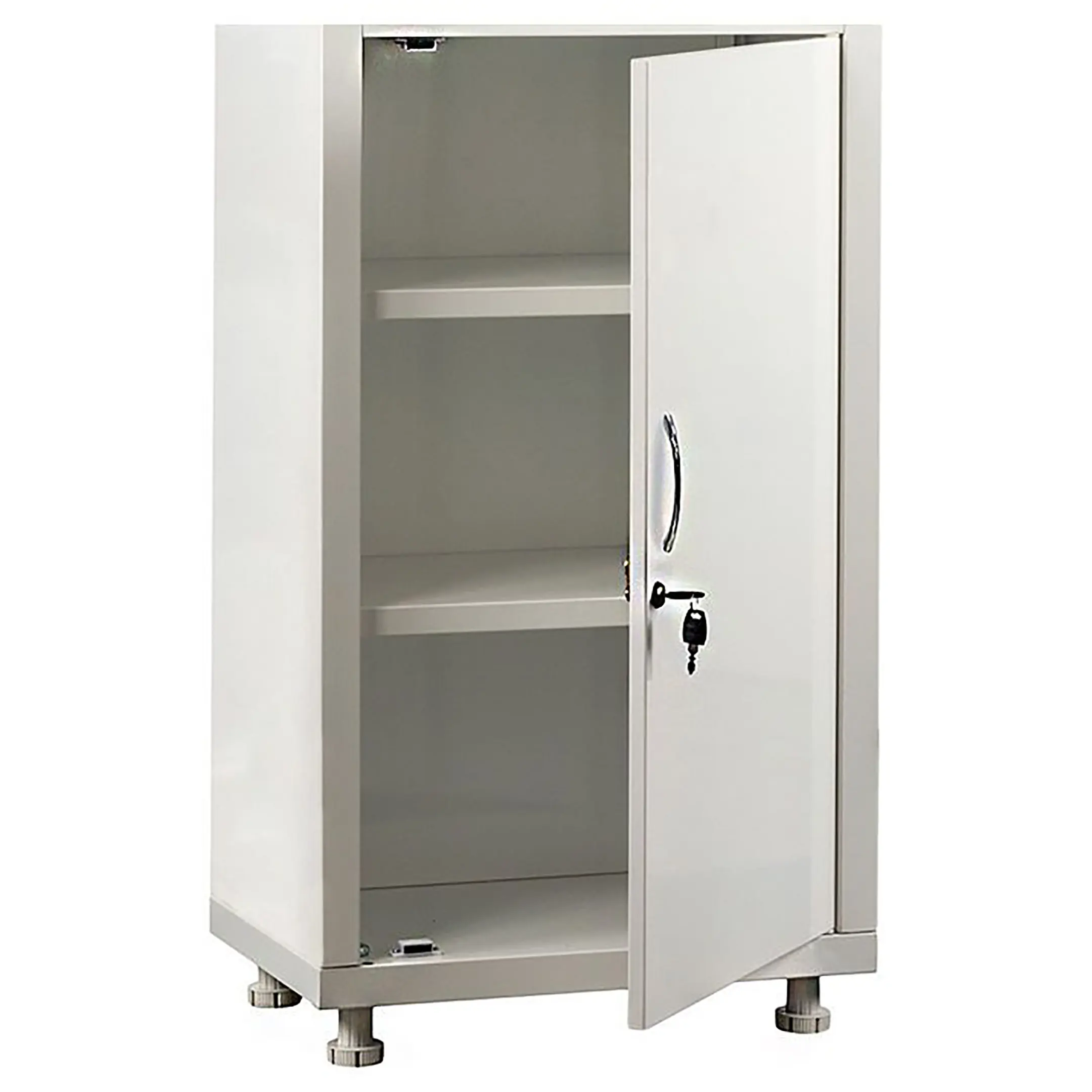 Шкаф предназначен для хранения медикаментов, инструментов, больничных документов, карточек пациентов в медицинских учреждениях и организациях. Изготовлены из стали, толщина корпуса 0,6мм, толщина двери 0,7мм, толщина стекла двери 4мм, толщина стекла полки 5мм. Хромированные магнитные защелки, фиксируют дверь в закрытом состоянии (устанавливаются на стеклянные двери). Комплектуется ключевыми замками Практик (1000 комбинаций), (замок устанавливается только на металлические двери). Максимальная нагрузка на металлическую полку - 30 кг, на стеклянную полку – 10 кг. поставляются в разобранном виде, в комплект поставки входят четыре регулируемые опоры (высота-100 мм, диапазон регулировки: 95-125 мм). Опция: установка трейзера (только в нижнее отделение). Окрашен порошковой краской. Цвет — белый (RAL 9016)