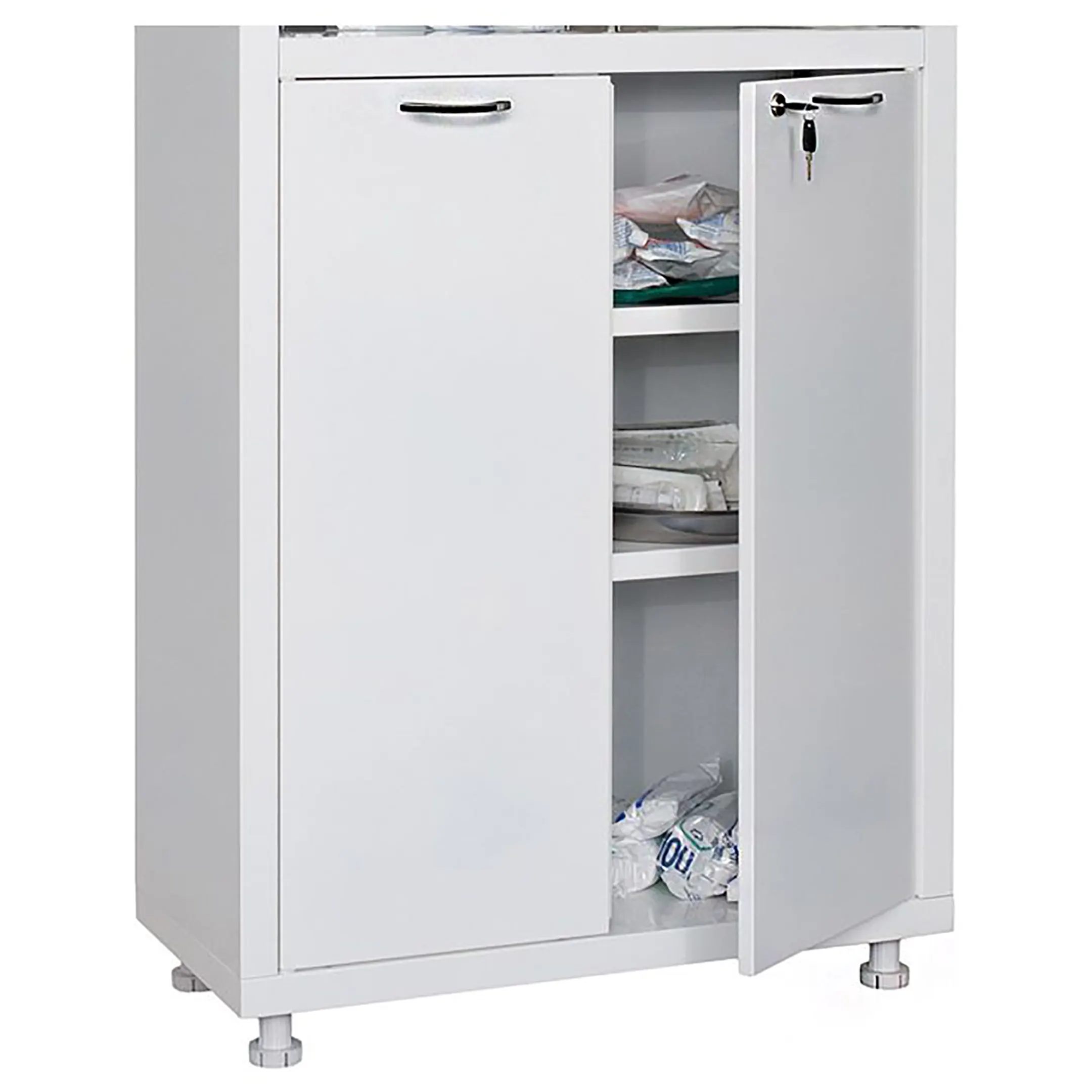 Шкаф предназначен для хранения медикаментов, инструментов, больничных документов, карточек пациентов в медицинских учреждениях и организациях. Изготовлены из стали, толщина корпуса 0,6мм, толщина двери 0,7мм, толщина стекла двери 4мм, толщина стекла полки 5мм. Хромированные магнитные защелки, фиксируют дверь в закрытом состоянии (устанавливаются на стеклянные двери). Комплектуется ключевыми замками Практик (1000 комбинаций), (замок устанавливается только на металлические двери). Максимальная нагрузка на металлическую полку - 30 кг, на стеклянную полку – 10 кг. поставляются в разобранном виде, в комплект поставки входят четыре регулируемые опоры (высота-100 мм, диапазон регулировки: 95-125 мм). Опция: установка трейзера (только в нижнее отделение). Окрашен порошковой краской. Цвет — белый (RAL 9016)