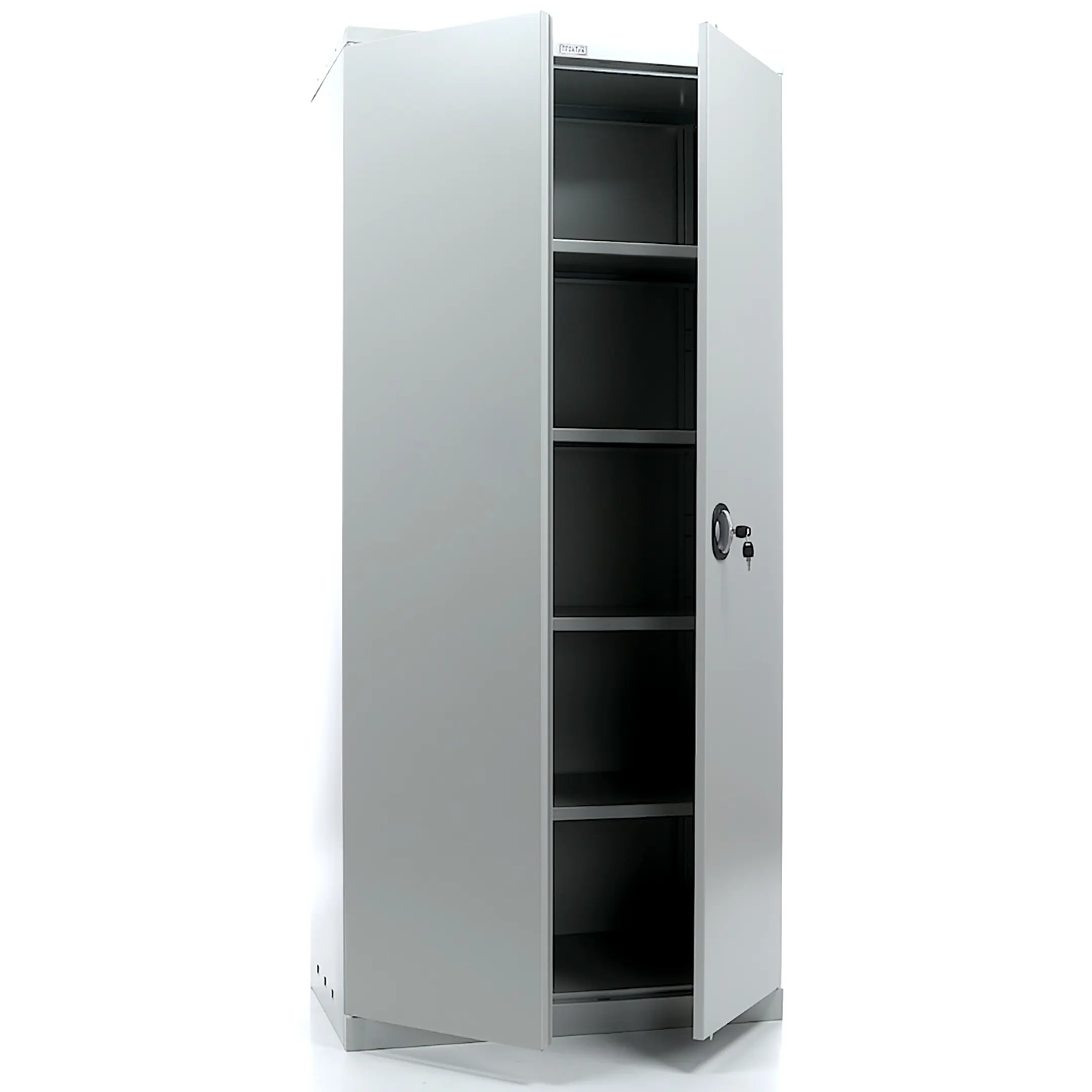 предназначены для хранения большого объема документов изделия сертифицированы на соответствие требованиям ГОСТ 16371-2014 ригели из оцинкованной стали и пластиковые втулки обеспечивают бесшумный ход дверей и надежное запирание шкафа комплектуются ключевыми замками с ручками (Burg GSC813) 5 уровней хранения (4 полки в комплекте) максимальная нагрузка на полку - 60 кг поставляются в разобранном виде