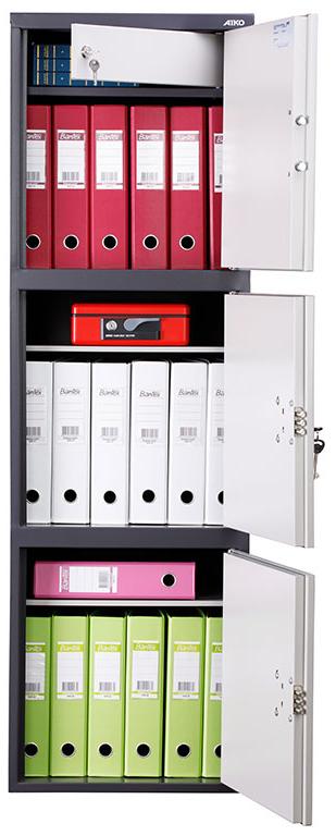 Шкафы предназначен для хранения документов в офисе. Сварная конструкция из листовой стали, толщина стали 1,2мм. Верхнее отделение комплектуется электронным кодовым замком с ключом аварийного открывания, нижние ключевым замком Практик. Внутри шкафов есть трейзер, полки съемная, регулируемые по высоте полка. Тип покрытия - порошковое, цвет светло-серый структурированный.