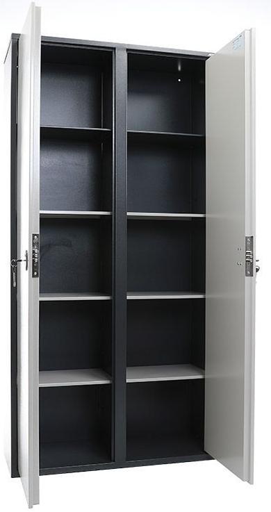 Шкафы предназначен для хранения документов в офисе. Сварная конструкция из листовой стали, толщина стали 1,2мм. Комплектуется ключевым замком Практик. Внутри шкафов есть трейзер, полки съемная (кроме верхней), регулируемые по высоте полка. Тип покрытия - порошковое, цвет светло-серый структурированный.