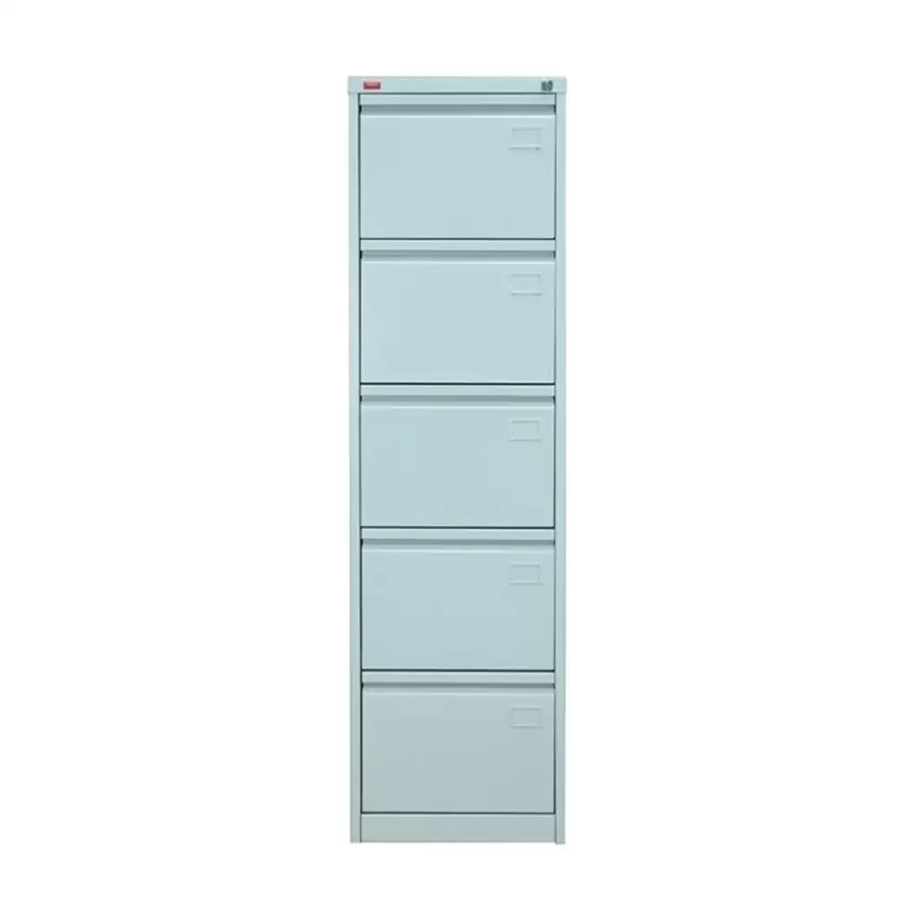 Шкаф картотечный металлический (картотека) сборно-разборный. Предназначен для хранения документов в подвесных папках формата Foolscap или формата A4. В картотеке пять выдвижных ящиков. Благодаря телескопическим направляющим каждый ящик может быть выдвинут полностью на всю глубину. Металлическая картотека КР-5 имеет центральный врезной замок и антиопрокидывающее устройство. Покрытие - полимерное порошковое светло-серого цвета (RAL 7035).