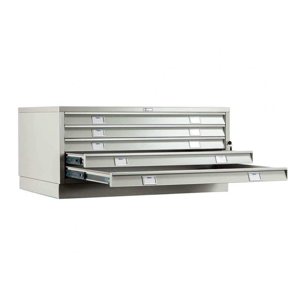 предназначены для удобного хранения документов формата А1 (геологоразведочные карты, планы и конструкторские чертежи), дополнительно можно установить разделители под формат А2, А3, А4 (опция) телескопические направляющие обеспечивают свободный и плавный ход ящиков даже при полной загрузке система полного выдвижения ящиков нагрузка на ящик - 20 кг возможность установки промежуточной секции из 5 ящиков, увеличивающей емкость модуля до 15 ящиков центральный ключевой замок поставляются в собранном виде