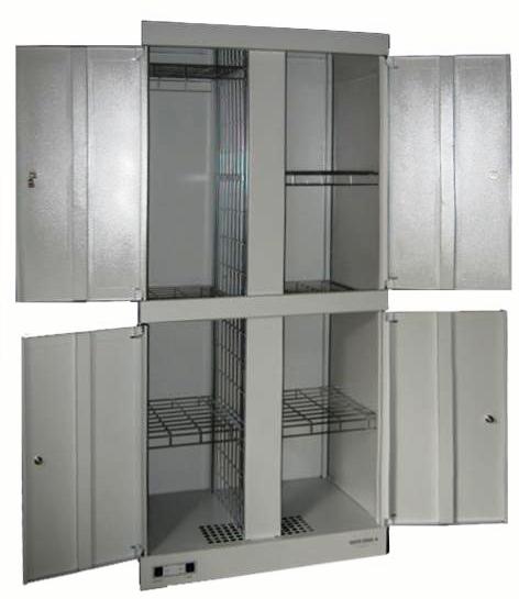 Сушильный шкаф ШСО 2000-4 предназначен для сушки мокрой одежды, обуви, белья, а также различной спортивной формы и инвентаря. Имеет 4 независимых отделения. Каждое отделение закрывается собственной дверью. И может запираться на собственный ключ. Внутри шкафа расположены съёмные сетчатые полки, которые позволяют выгодно использовать пространство сушильного шкафа (сушить одежду практически любой длины). Шкаф можно подсоединить к вытяжной вентиляции. Для этого на крыше шкафа имеется фланец для подсоединения гофротрубы. Цвет RAL 7035 Питание 220В / 50ГцПотребляемая мощность:эл/двигатель – 60 Втнагревательный элемент – 2000 ВтЗащита от перегрева: естьРежимы сушки: До 40гр, до 60гр, проветриваниеТаймер: 4 часа, бесконечностьУровень шума: не более 55 дБПроизводительность вентилятора 360 м3/чОплачивайте покупки удобным способом. В интернет-магазине доступно 3 варианта оплаты: