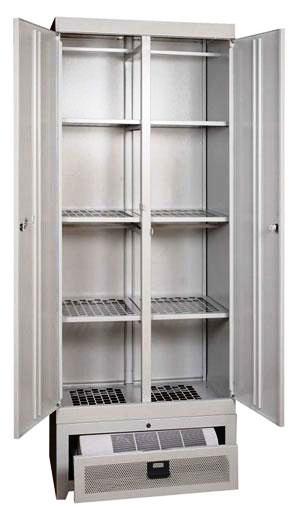 Сушильный шкаф ШСО-22М предназначен для сушки мокрой одежды, обуви, белья, а также различной спортивной формы и инвентаря. Шкаф состоит из двух базовых элементов: шкафа и подставки, соединенными друг с другом болтами. Верхняя часть представляет собой две секции, каждая из которых закрывается на свой ключ. Внутри каждая секция снабжена тремя подвесными сетчатыми полками и двумя перекладинами. На полки можно укладывать для сушки рукавицы, головные уборы или обувь. Сняв полки, на перекладины можно повесить одежду, как в один ярус, так и в два (детскую одежду). Подставка сушильного шкафа ШСО-22р запирается на откидывающуюся дверцу, через которую осуществляется доступ к управлению тепловентилятором Delta D-2002. С помощью пульта дистанционного управления тепловенилятором можно управлять не открывая дверцу.Цвет RAL 7047 Питание 220В/50ГцМощность 2000 ВтОплачивайте покупки удобным способом. В интернет-магазине доступно 3 варианта оплаты: