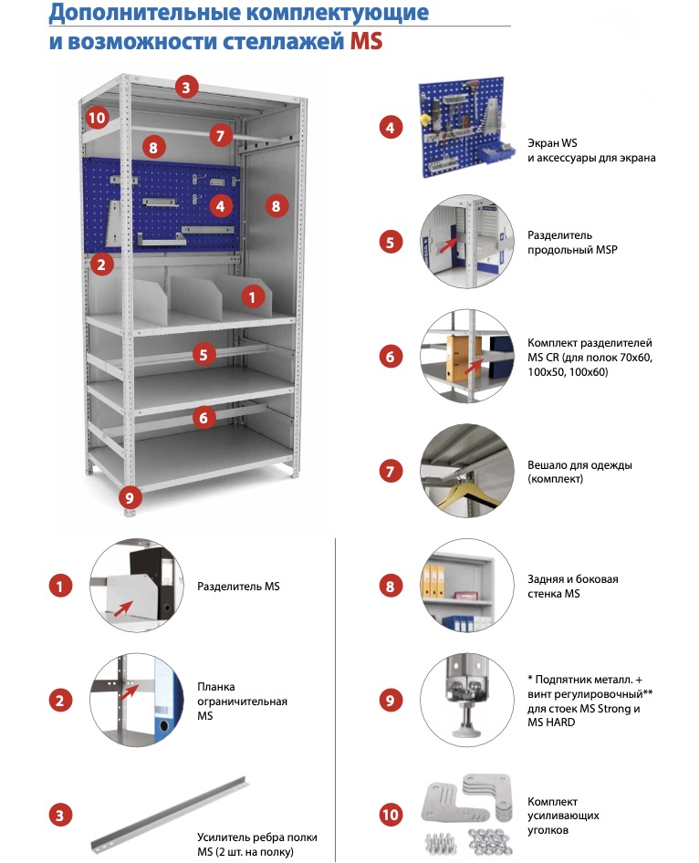 для безопасной эксплуатации стеллажей высотой более 2-х метров необходимо на центральную полку устанавливать дополнительный Комплект усиливающих уголков MS (для одной полки)