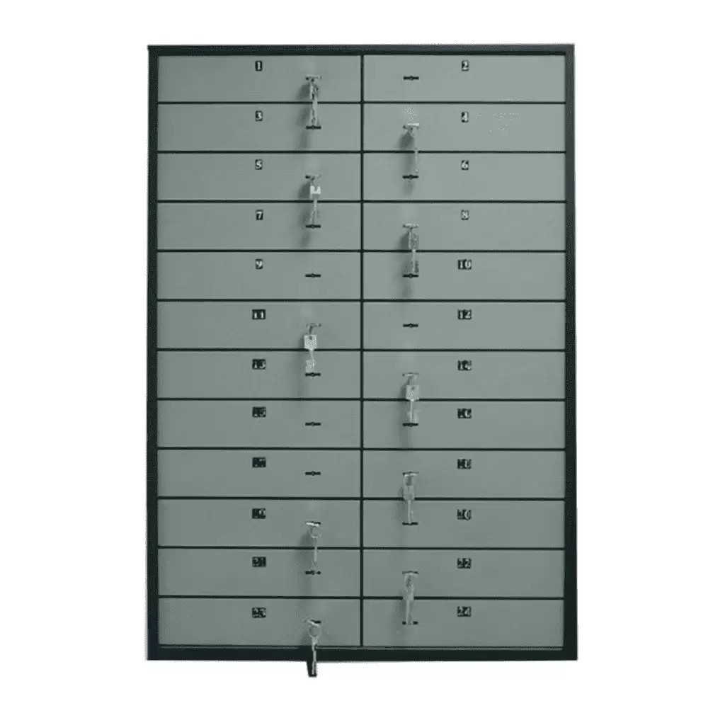 предназначены для оборудования хранилищ в банках и камер хранения в гостиницах толщина лицевой панели ячейки - 3 мм комплектуются двухключевыми замками (банк + клиентский) с одной скважиной KABA MAUER, с перенастраиваемым замком банка порядок нумерации ячеек указывается при размещении заказа возможна комплектация ячеек металлическими кассетами с устройством для опечатывания внешняя отделка дверей ячеек, окраска под алюминий