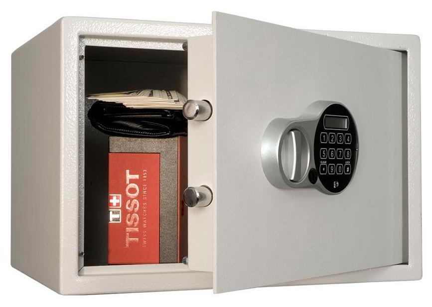 предназначены для хранения документов и ценностей дома, в офисе и в гостиничных номерах толщина лицевой панели – 2.8 мм толщина боковых стенок – 1.2 мм комплектуются электронным отельным замком + аварийный мастер-ключ (Промет, Россия), работает от 4-х батареек ААA (1,5 V), программируемый шифр замок оснащен звуковыми и световыми индикаторами предусмотрено анкерное крепление к полу и стене