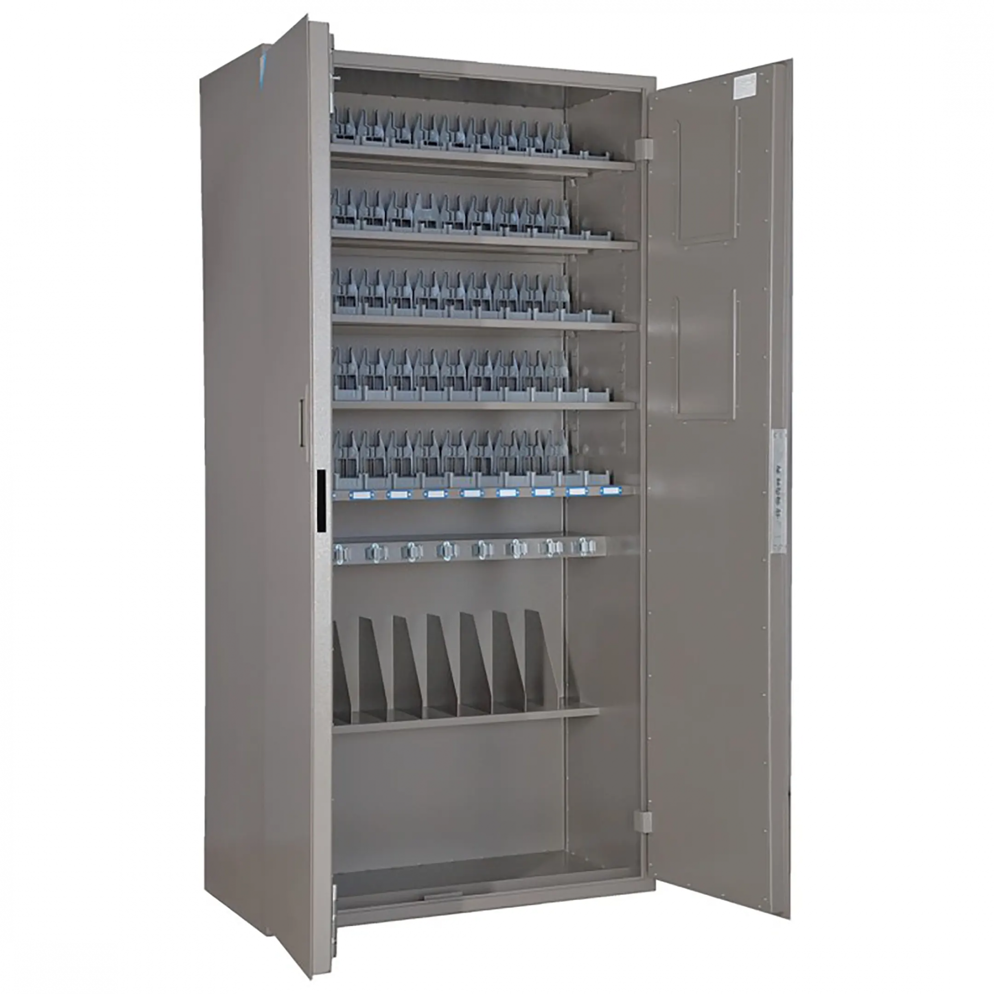Сейф оружейный односекционный ОШ-10АКСУ-65ПУ сертифицирован на устойчивость к взлому по ГОСТ Р 50862-2005 п.п. 5.1., 5.2. и соответствует классу Н0 (ниже нулевого) устойчивости к взлому. Корпус сейфа толщиной 3 мм, дверь толщиной 3 мм. Сейф односекционный, на 10 стволов и 65 ПУ. Ложементы — металлические держатели с резиновыми роликами — 10 штук и пластиковые подставки под пистолет ПМ — 65 штук. Первый замок ключевой 8-ми сувальдный тяговый ЗАО «Про-Сам» г. Рязань класс 4 ГОСТ 5089-03 или аналогичный замок другого производителя. Второй замок ключевой 8-ми сувальдный ЗАО «Про-Сам» г. Рязань или аналогичный замок другого производителя. Цвет: Серый с эффектом молотковой эмали.