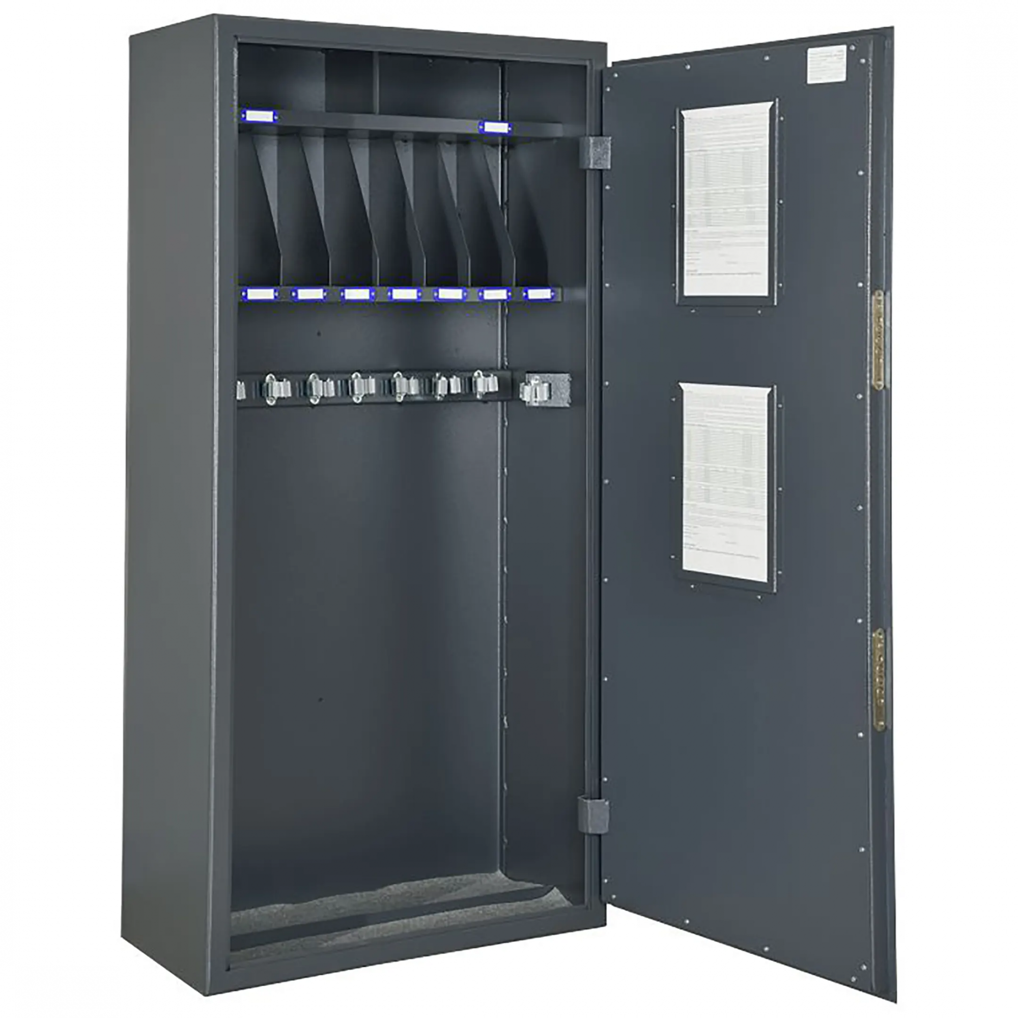 Сейф оружейный односекционный ОШ-10АКМ сертифицирован на устойчивость к взлому по ГОСТ Р 50862-2005 п.п. 5.1., 5.2. и соответствует классу Н0 (ниже нулевого) устойчивости к взлому. Корпус сейфа толщиной 3 мм, дверь толщиной 3 мм. Сейф односекционный, на 10 стволов. Ложементы — металлические держатели с резиновыми роликами. На внутреннюю сторону двери устанавливаются 2 рамки под опись. Два замка ключевых 8-ми сувальдных ЗАО «Про-Сам» г. Рязань или аналогичные замки другого производителя. Цвет: Серый.