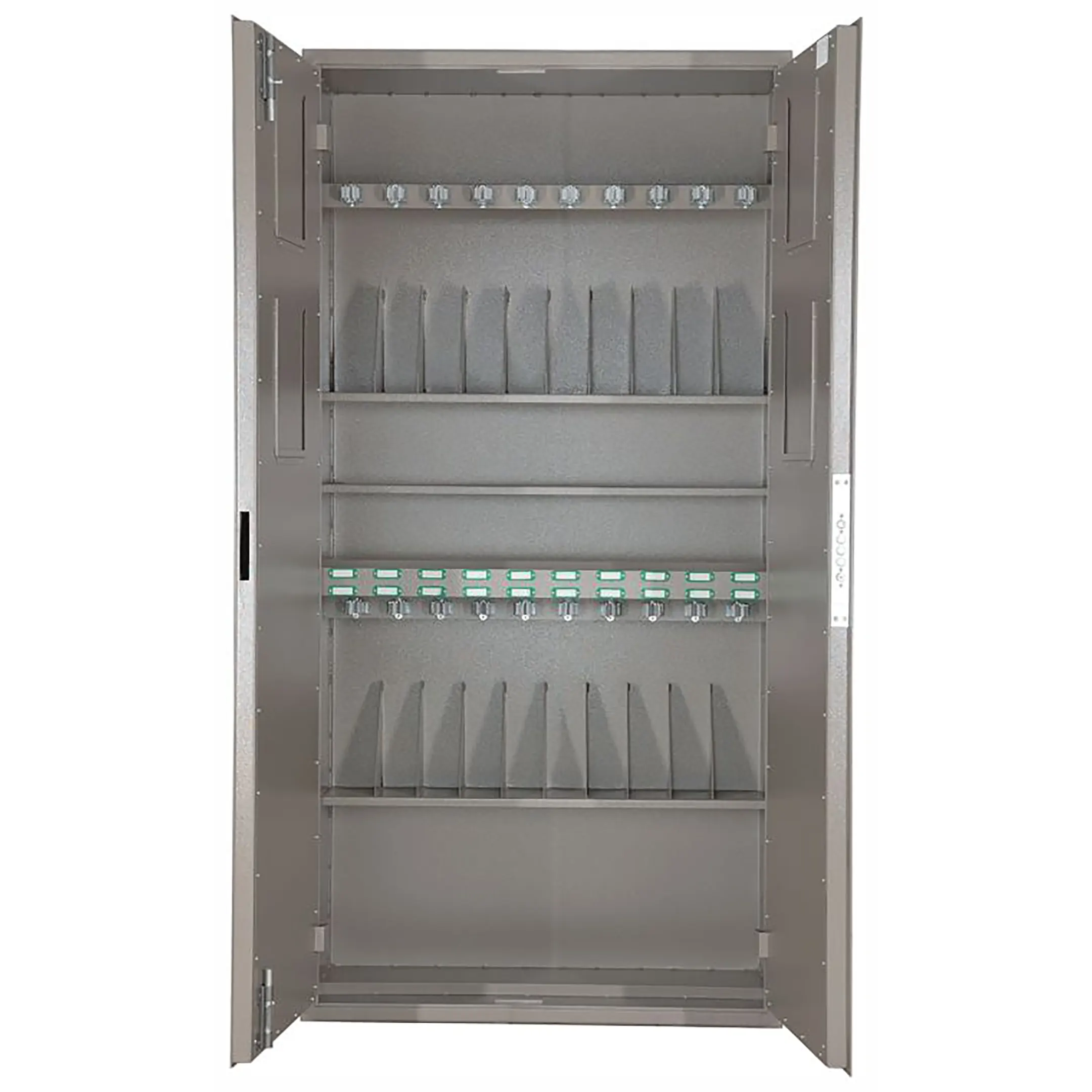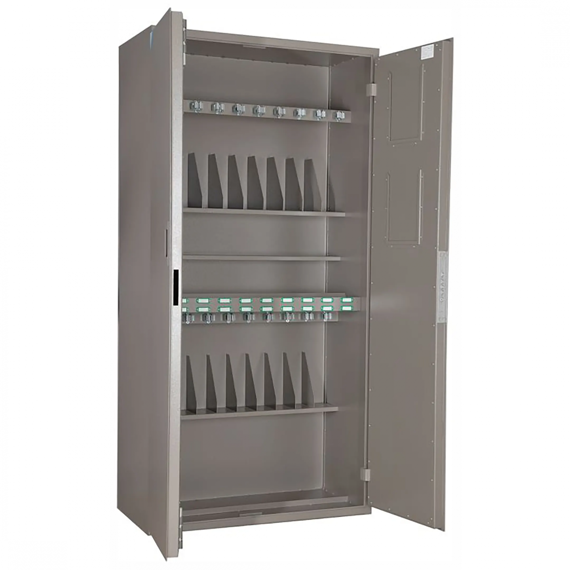 Сейф оружейный двухсекционный ОШ-20С сертифицирован на устойчивость к взлому по ГОСТ Р 50862-2005 п.п. 5.1., 5.2. и соответствует классу Н0 (ниже нулевого) устойчивости к взлому. Корпус сейфа толщиной 3 мм, дверь толщиной 3 мм. Сейф двухсекционный, на 20 стволов, оборудован дополнительной секцией для хранения боеприпасов. Ложементы — металлические держатели с резиновыми роликами. На внутреннюю сторону двери устанавливаются 2 рамки под опись. Два замка ключевых 8-ми сувальдных ЗАО «Про-Сам» г. Рязань или аналогичные замки другого производителя. Цвет: Серый с эффектом молотковой эмали.