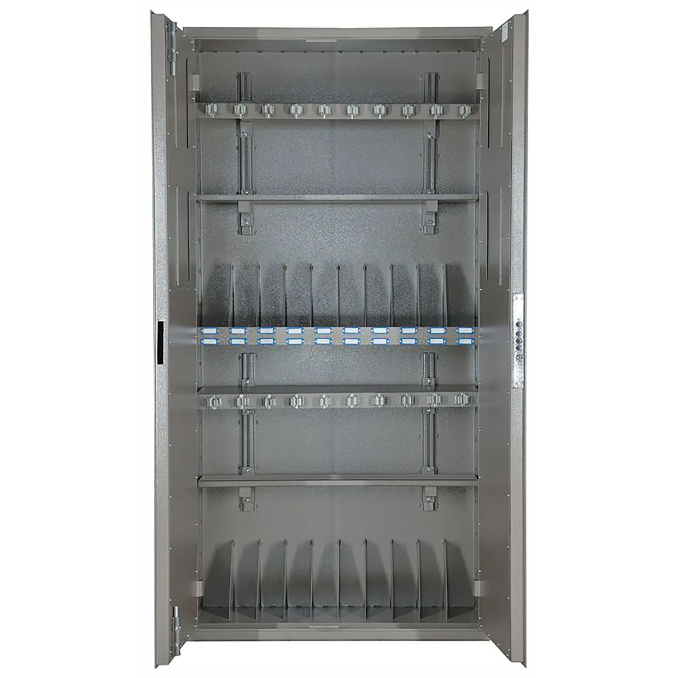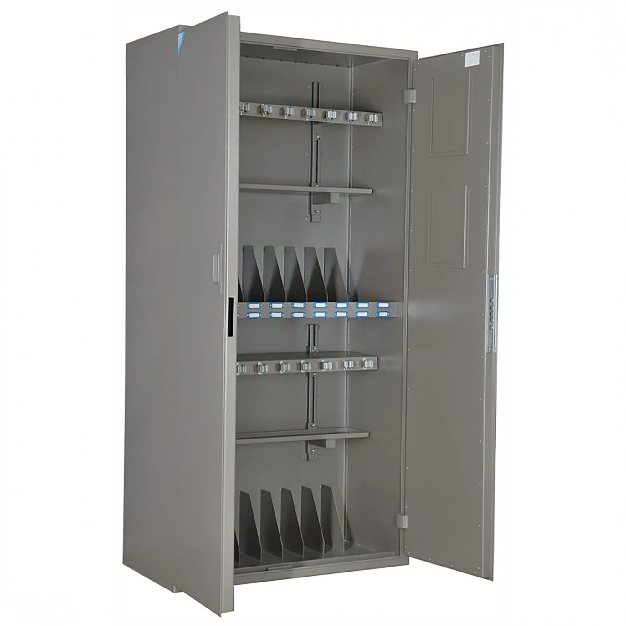 Шкаф металлический оружейный. Корпус шкафа изготовлен из стального листа толщиной 3 мм, полотно двери 3 мм. Установлен комплект ложементов для 20 автоматов АК или АКМ или АКСУ. Окраска порошковая полимерная