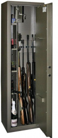 Внешн. размеры, мм *: 1500x450x350 Внутр. размеры, мм *: 1495х290х287 Вес, кг **: 88 Внутренний объем, л: 125/7 Количество полок: 3 Высота ружей, мм: 1450 Количество стволов: 4 Тип замка: Электронный Класс взломостойкости: 0 Производитель: VALBERG (Россия) Гарантия, лет: 5 Цвет: Корпус - оттенок коричневого с эффектом молотковой эмали, дверь - оттенок зелёного Оружейный сейф Valberg Сафари EL — Предназначается для надёжного и комфортного размещения четырёх единиц оружия со стволами не длиннее 1,45 м.— По итогам тестов на степень устойчивости к взлому отнесён к классу 0 в соответствии с ГОСТ Р 50862-2005. — Корпус изготавливается из стальных листов не менее трёх миллиметров толщиной. — Коробчатую дверь, подвешенную на внутренних петлях, усиливает лицевая панель порядка пяти-шести миллиметров. — Дверь снабжена электронным замком PS-300 высокой секретности (class A, ECB-S), с энергонезависимой памятью и наружными контактами для открывания при разряженной батарее. Допускаются коды из 4-8 цифр. Питание от батареи 9В типа «Крона» — Прочное запирание обеспечивается трёхсторонним ригельным механизмом. Защиту замковой области и ригелей от вскрытия слесарными инструментами осуществляет металлическая пластина из специального твёрдого сплава. — В сейф встроен трейзер – патронное отделение, снабжённое собственным ключом. — Для максимального удобства при хранении ружей имеются роликовые зажимные ложементы. — Комплектация включает съёмные полочки с регулировкой по высоте, а также рамку для размещения ножей и гребёнку для шомполов и ключей, прикреплённые к двери изнутри. — Дно покрыто мягким ковролиновым ковриком. — Изделие сконструировано исходя из требований ст.59 Постановления правительства РФ № 814 от 21 июля 1998 года «О мерах по регулированию гражданского и служебного оружия и патронов к нему на территории РФ». — С целью повышения надёжности и устойчивости изделия рекомендовано крепление к полу или стене посредством имеющихся в корпусе анкерных отверстий. |