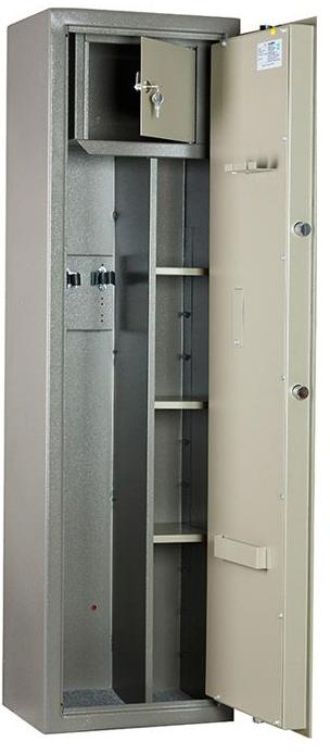 — Комплектация включает съёмные полочки с регулировкой по высоте, а также рамку для размещения ножей и гребёнку для шомполов и ключей, прикреплённые к двери изнутри.