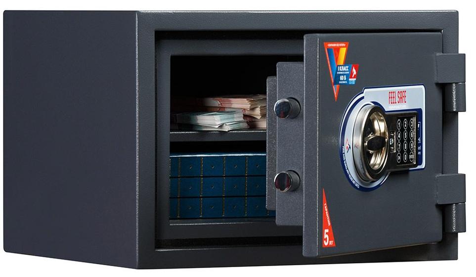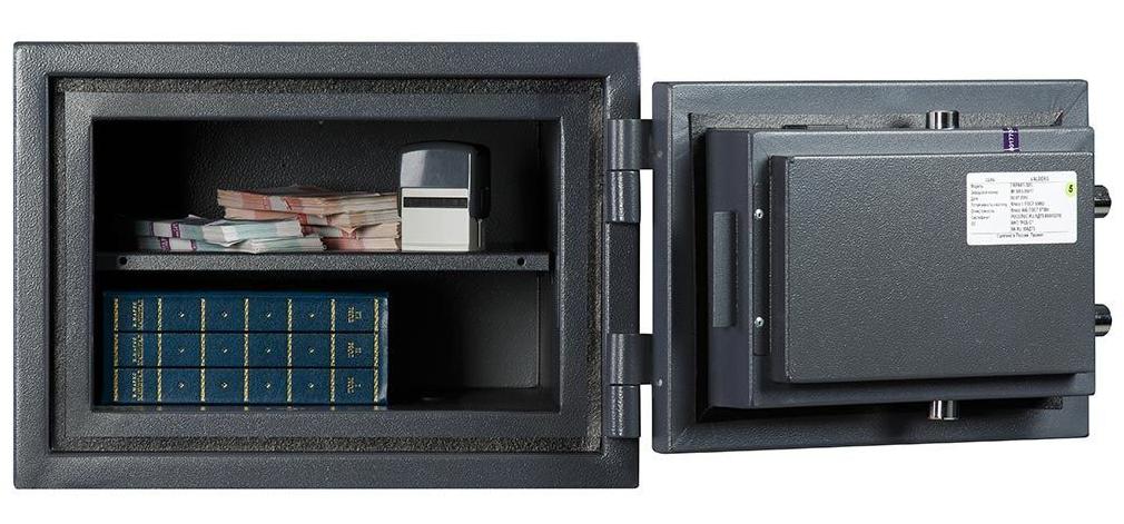 Сейф огневзломостойкий, производство - Россия. Устойчивость к взлому класс 1 и на класс 60Б (60 минут защиты от пожара) защиты от пожара по ГОСТ Р 50862-2005. Корпус сейфа представляет собой двухслойную конструкцию с наполнением. Межстеночное пространство заполнено запатентованным составом огнестойкого бетона. Корпус сейфа выполнен из стали, толщина боковых стенок 56 мм, общая толщина двери 92 мм. Замок электронный кодовый. 3-х сторонняя ригельная система запирания. Защита замка и ригелей от высверливания и выбивания. Система блокировки ригельного механизма при выбивании замка. По периметру дверной проем проклеен огнестойким уплотнителем. Внутри сейфа 1 полка. Возможно крепление к полу (наличие отверстия в нижней части). Окрашен порошковой краской, цвет: графит структурированный. Гарантия 1 год.