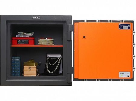 устойчивость к взлому: класс 5 в системе ECB-S (Европейский орган сертификации - DAkkS (Германия) для сейфов, поставляемых в Европу, сертификат № 1506/SA15-04 от 23.09.2015 и 5 класс по стандарту ГОСТ Р 50862-2012 в системе сертификации (Российский орган сертификации АНО РСБ-С) для сейфов, поставляемых в Россию при заливке двери и корпуса используется запатентованная система высокопрочного армированного бетона 3-х сторонняя усиленная ригельная система запирания (диаметр ригеля 38 мм) c дополнительным комплектом блокировок сплошной пассивный ригель, залитый бетоном защита замков и ригелей от высверливания, выжигания и выбивания защита ригельного механизма каленым стеклом защита ригелей и ригельных тяг от кислородного копья (профессиональный инструмент) система блокировки ригельного механизма при выбивании замка защита от выдавливания двери гидравлическим инструментом защита двери от выжигания, выбивания и демонтажа замка толщина защитного слоя двери – 70 мм, общая толщина двери - 166 мм толщина боковых стенок - 72 мм комплектуются кодовым электронным замком PS 600/E36 + ключевой замок KABA MAUER (в комплекте 2 ключа) наличие анкерного крепления к полу и стене. Анкерные болты в комплекте