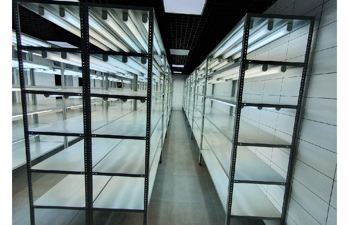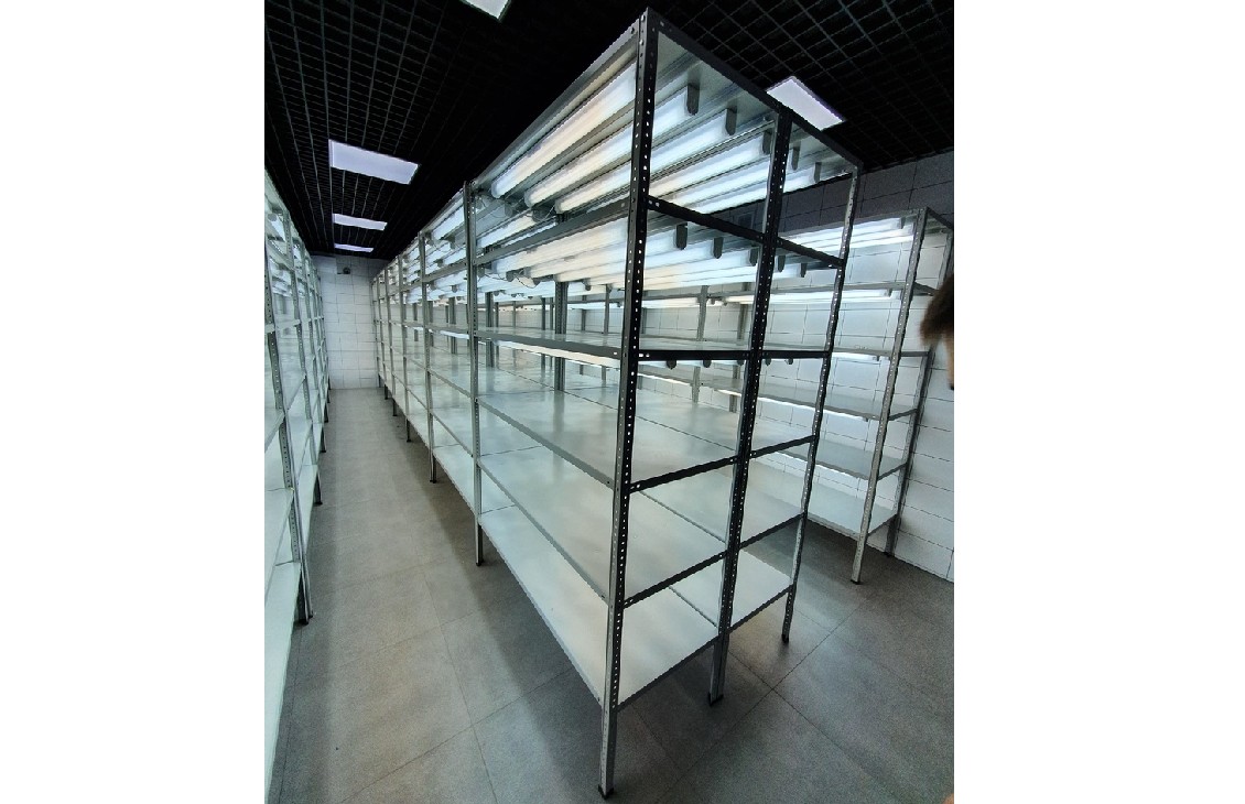 Оборудование стеллажей люминесцентными лампами (3шт под каждой полкой) и кнопкой-выключателем на каждой полке для выращивания растений.